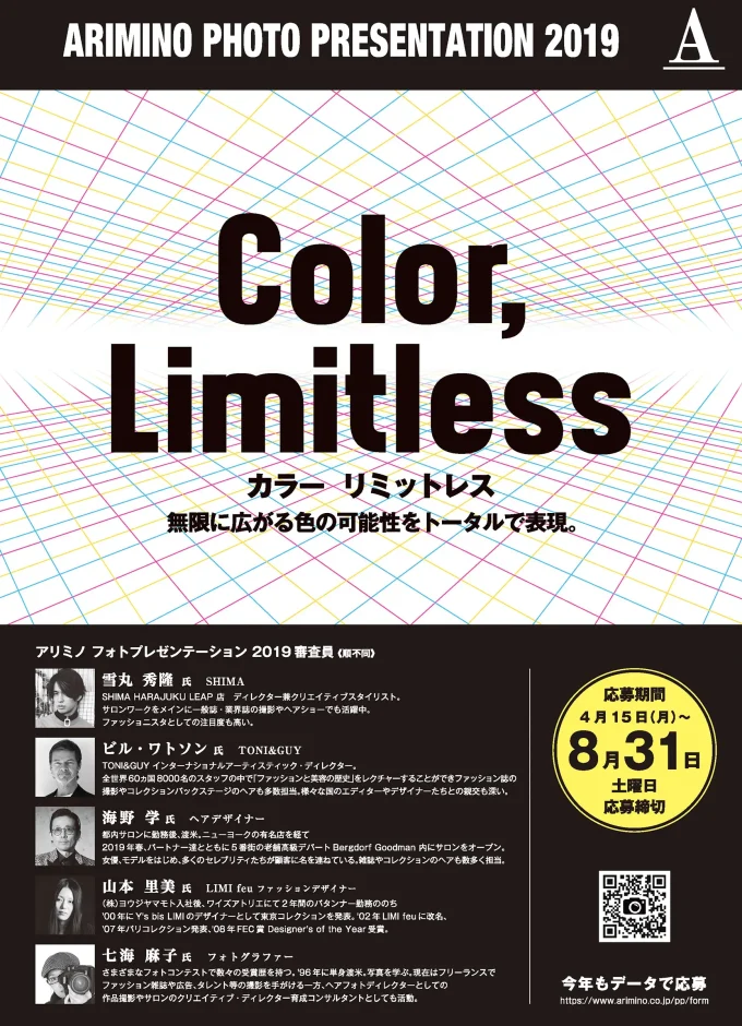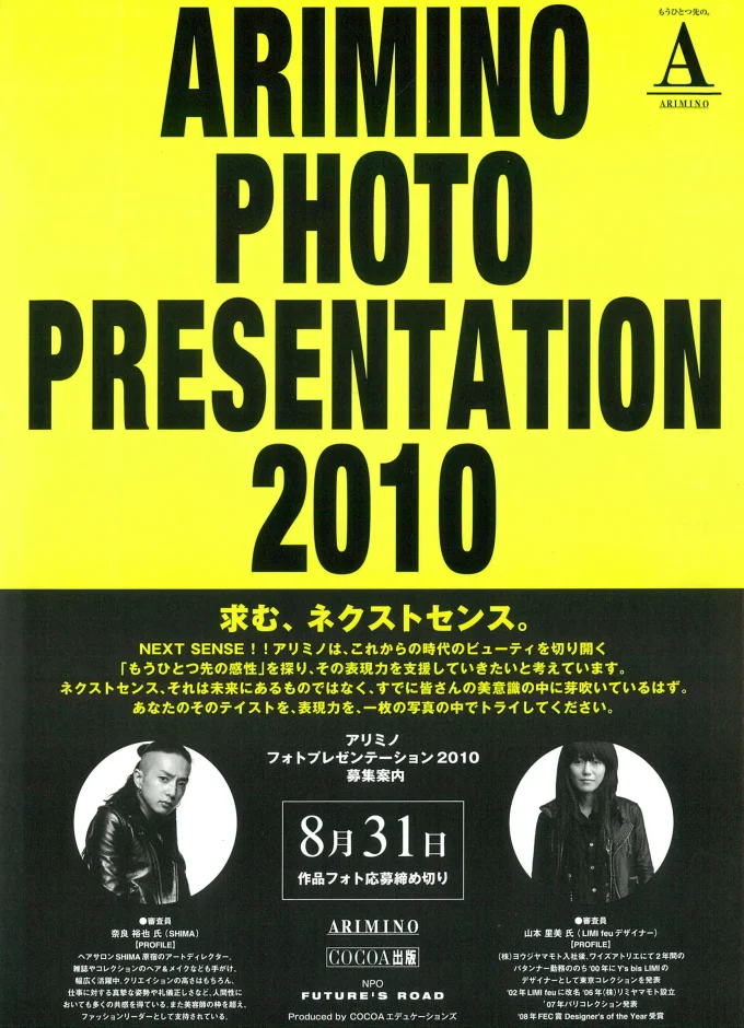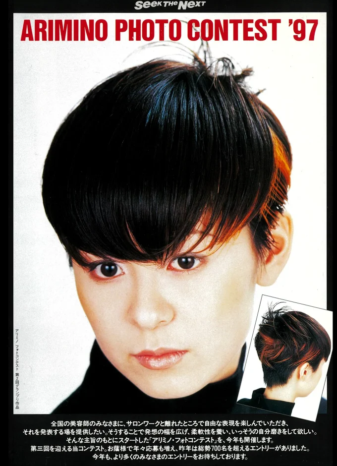 アリミノフォトプレゼンテーションは、1995年に始まった、美容師や美容学生が自由な発想で表現力を競うフォトコンテストです。ヘアだけに限らず、トータルコーディネートやシチュエーションも含めた、全体の発想力や美意識が表現された作品を募集しています。