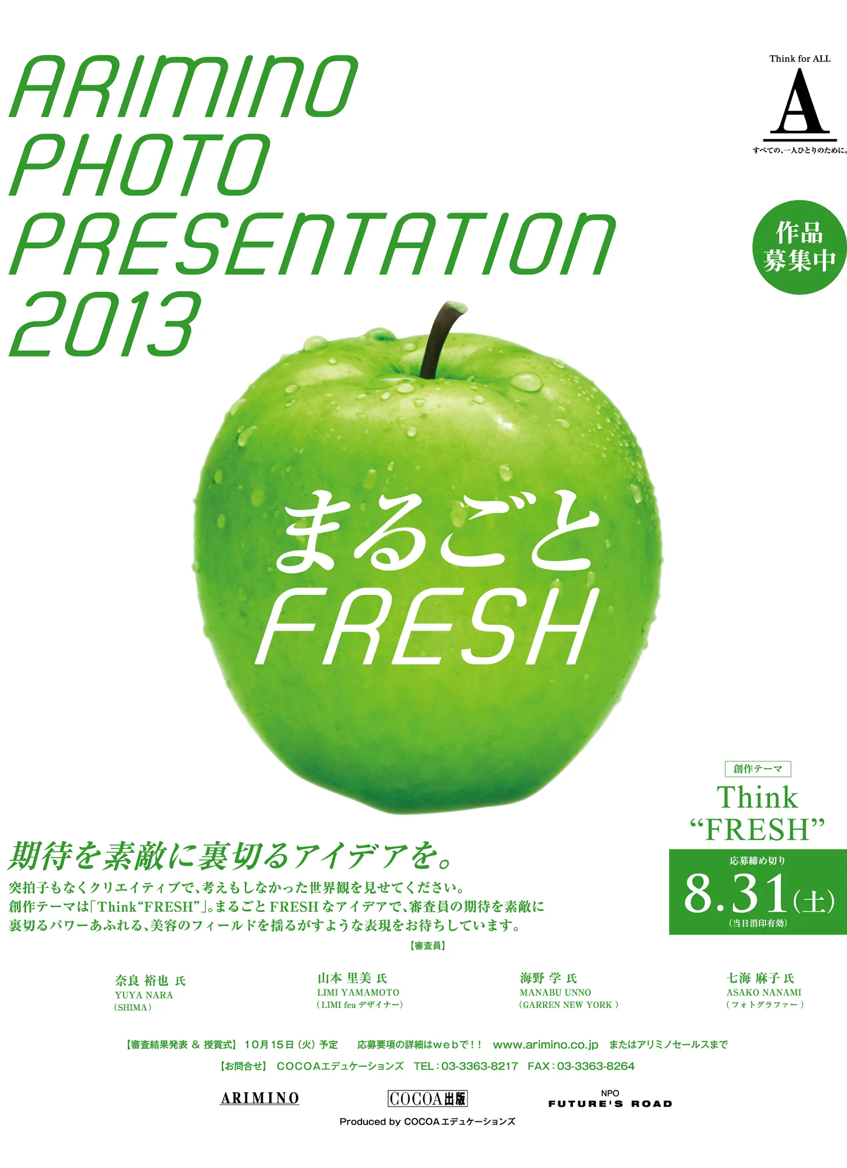 創作テーマは「Think “FRESH”」。まるごと FRESHなアイデアで、審査員の期待を素敵に裏切るパワーあふれる、美容のフィールドを揺るがすような表現をお待ちしています。